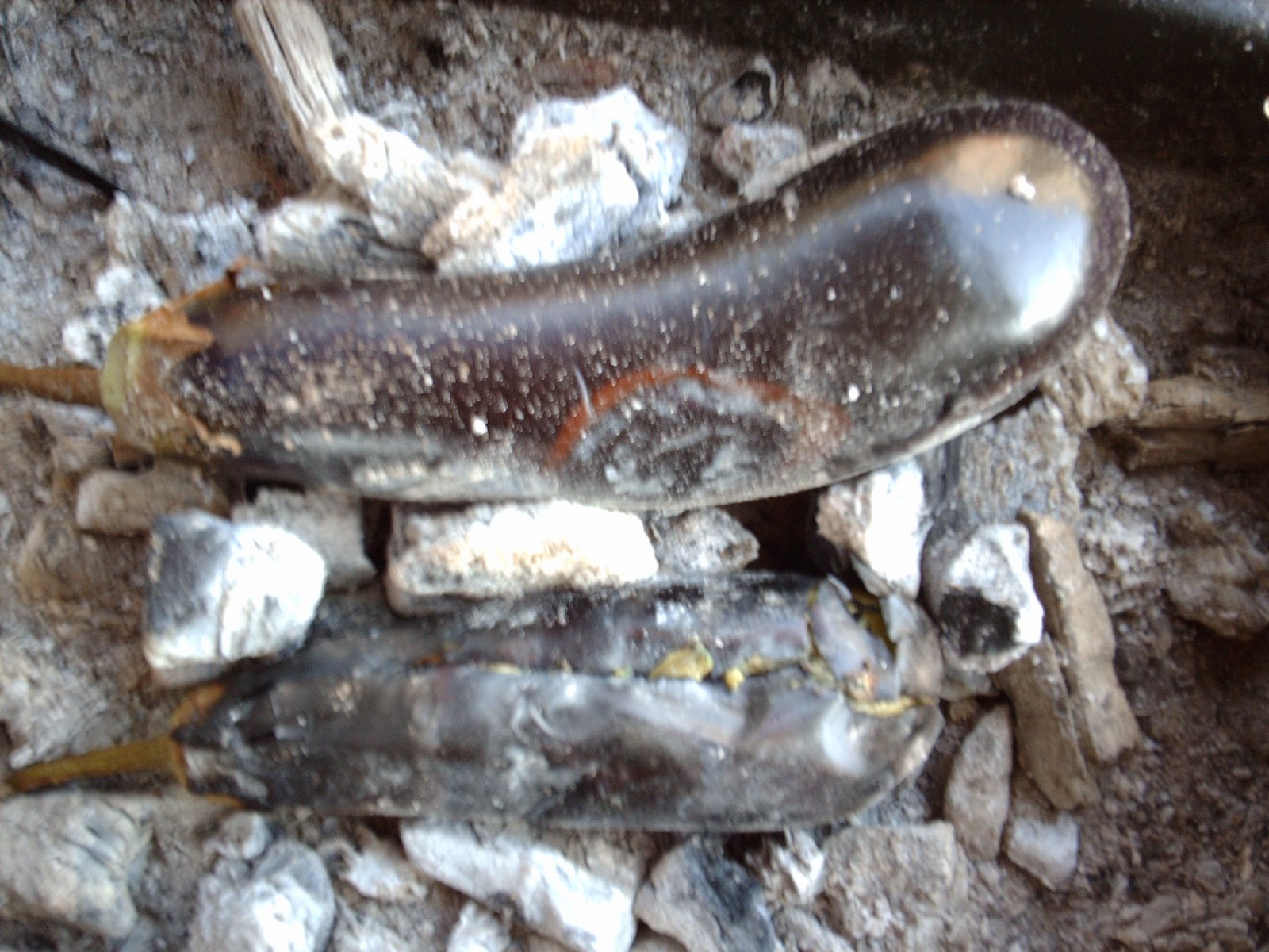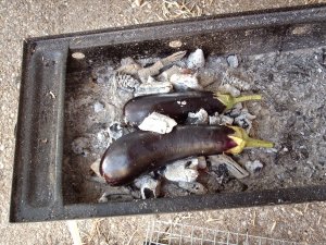 Step 1: Place the eggplants on the grill – as pictured – or directly on the coals if you prefer. Once they are white with heat, wait for them to explode – sort of like a sausage bursting a seam.