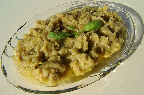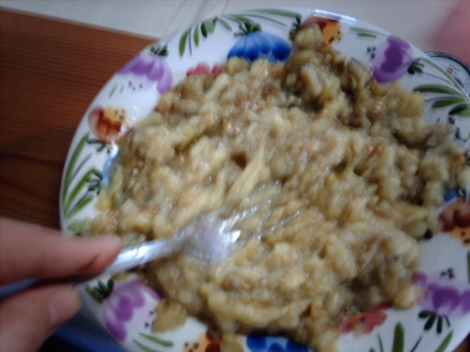 Step 2: After getting them blackened and soft with a split seam, so to speak, extract the soft, oozy interior, mashing the strands of eggplantness with a fork while mixing in extra virgin olive oil, crushed (vs. chopped) raw garlic to taste – we use a whole bulb, but we are garlic fanatics), fresh lemon juice and salt.