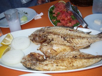 Grilled fish with tomato and arugula salad and rakı on our last night in Bodrum
