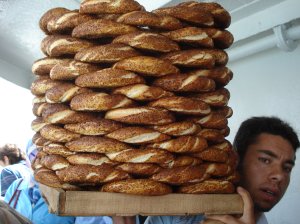 Simit - a savory bagel-like, pretzel-shaped pastry covered with sesame seeds - eaten often at tea, but for breakfast on the run today