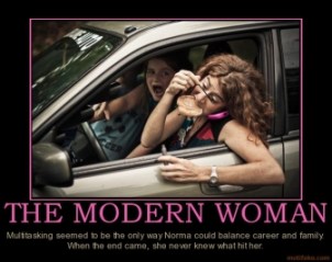 So, it all got cleaned up. I was a little late to see my student. I didn’t have another accident, but tonight when I got home, the puppets staged an intervention. They have determined, they tell me, that I have to be happy, healthy and safe in life, and something has to change. They are engaging in a morning tea boycott until I can make some healthy choices in my life to get through this Lyme’s recurrence or walking pneumonia or whatever it is…at least until then, if not more, they are adding. They hopped onto my laptop and jumped around on the keys (a great string of them, each on the other’s shoulders, so their wax paper selves would have enough weight to press the keys). They are the ones who found the “modern woman” demotivational poster pictured above. “You don’t want to be that woman!” they tell me, with grave, gravely voices and stern furrowed brows. They are threatening to whisper to M. at night about the benefits of keeping me in a New England-style one-woman harem from now on…it’s getting into serious territory with these tiny wax paper figures in my brain. Something’s gotta give, I guess it’s gotta be the meatball submarine sandwiches while driving…and the public consumption of red bull…and probably a lot more than that. Let’s see what happens.