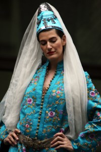 Eventually, the hubbub led to some consensus, and everyone decided to wear what they would – a true diaspora of fashionistas…Khadijah decided that she would wear her wedding attire, as she loved it so. Celebi was deciding between a red silk suit in modern style – and a moss green suit of silk shantung more like those worn in Mustafa Kemal Ataturk’s time – although not in that color or fabric! Hacivad Bey decided on wearing a pumped up turban, to use the modern parlance, perhaps best described as being akin to Sultan Sulayman’s fashion choice in his Venetian portrait.