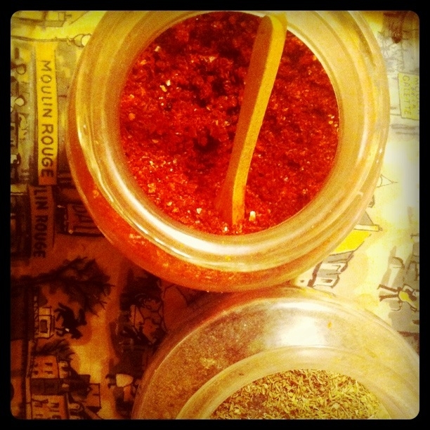 Our stash of pul biber (Aleppo pepper) and kekik (dried thyme) in old, hand-blown glass malacology specimen jars on my Granny