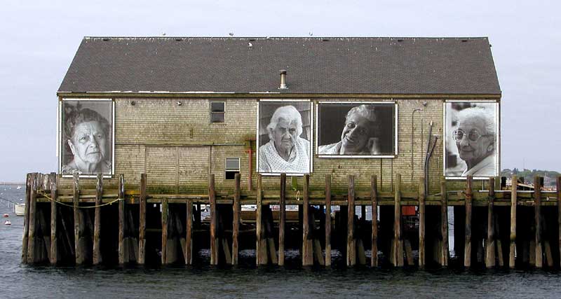 This amazing installation is described at iamprovincetown.com as follows: “They Also Faced The Sea” installation was designed to keep the spirit and the presence of Portuguese culture alive by Ewa Nogiec, artist, publisher of iamprovincetown.com and owner of Gallery Ehva, and Norma Holt, photographer. The installation of five larger-than-life black and white photographs of Provincetown women of Portuguese descent, mounted on a building at the end of Fisherman’s Wharf in Provincetown Harbor, is conceived as a tribute to the Portuguese community and its fishing heritage. Norma Holt’s photographs from Pilgrim Monument and Provincetown Museum co lection of Almeda Segura, Eva Silva, Mary Jason, Bea Cabral and Frances Raymond, are meant to represent all of the women of Provincetown who over the years have been the backbone of this vital fishing village. They came from a long line of hard-working people, immigrating mostly from the Azores and mainland Portugal. Their families fished the waters off Cape Cod for over 200 years, built a major fish packing and distribution industry and made an important contribution to the history and culture of Provincetown. Portuguese women faced the sea in many ways: as mothers, wives, sisters, friends and family of fishermen, as cooks, laundresses, nurses, teachers and telephone operators. They kept the culture alive, sang the songs, danced the dances, buried the dead, gave birth, cooked and kept the church at the center of their lives. Above all, they were resilient through good times and bad, their strength and courage easily matching and supporting that of their male seafaring counterparts.”