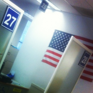 After obtaining various forms, permissions and stamps from floors 1, then 4, then 1 and finally 2 (the puppets swaying along on my shoulders, purse and hair the whole time, unphased), I set in to wait. Checking my trusty-dusty iphone, thanks to some pirated Internet as the dratted thing has stopped locating telephone signals altogether, I noted that the Registry of Motor Vehicle’s website indicated an average wait of 1 hour and 7 minutes. Realizing that I was in for the long haul, with no place to sit, I ambled up to a wall-leaning spot and commenced to chat with whomever seemed most willing to chat back.