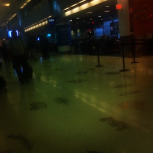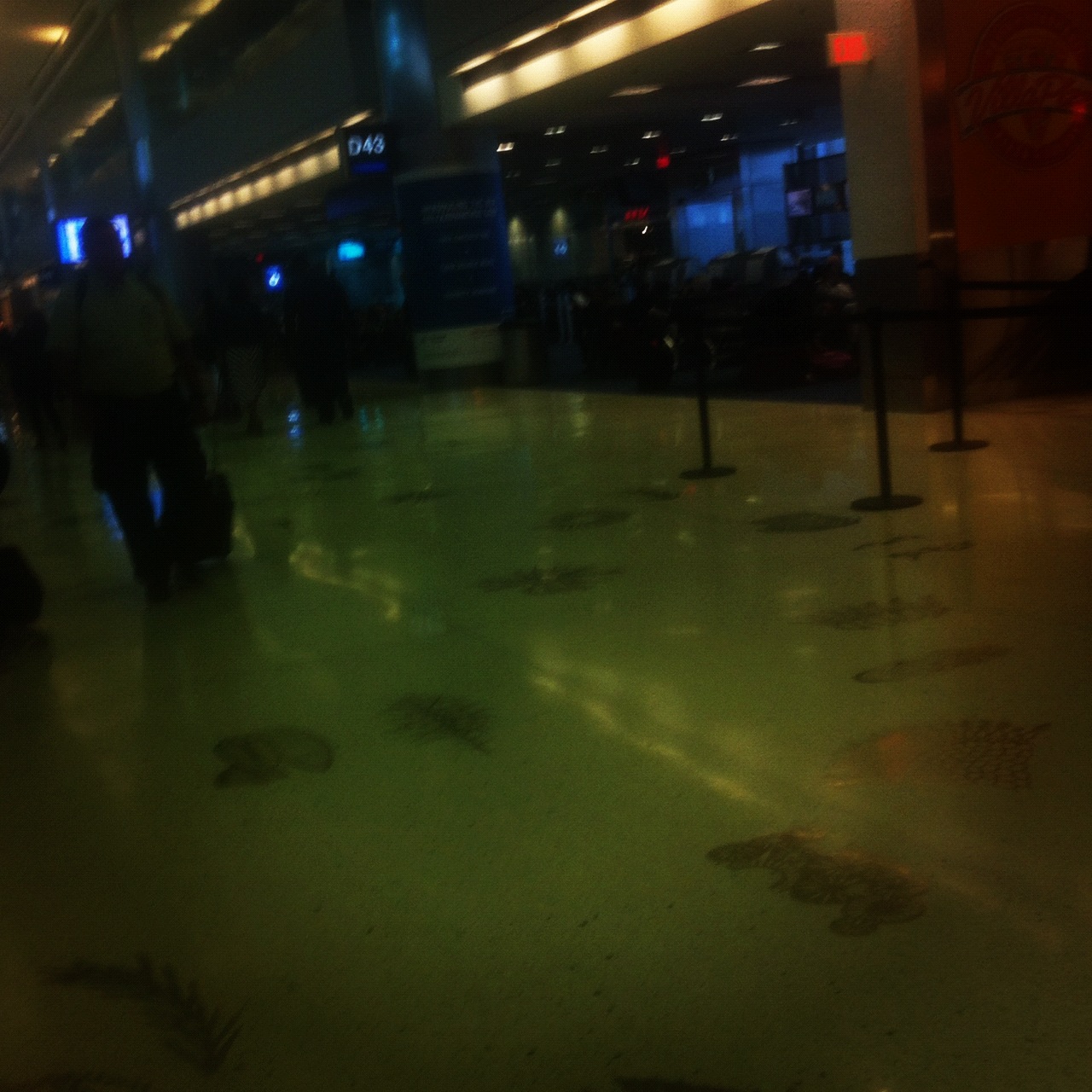 And, those puppets, they were especially enamored of the gilded marble floors in the Miami International Airport – especially as that gilding were all in the shape of sea creatures (see their photos, below, after the post).