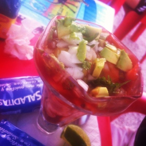 Coctel de mariscos in Tulum Pueblo at El Camello – the puppets swoon so much that they almost fall in and get marinated by lime juice