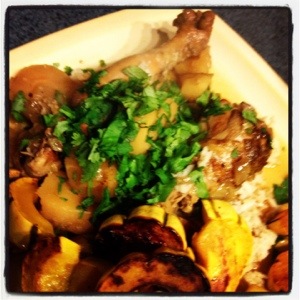 Our final product – looks homemade – chicken and parsnip tagine with coriander and cilantro, with roasted Delicata squash and brown rice as well (Image by Liz Cameron)