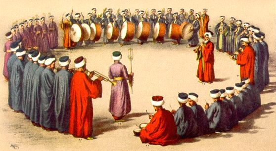 An image of an Ottoman-era military band – many of the male Karagoz puppets served in a military band of this nature before retiring to work as puppets in the Sultan