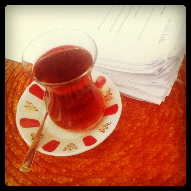 Papers to grade, tea to drink…life in a Turkish-American household revolves around the consumption of these tiny glasses of tea although we have shifted from the traditional sugar lumps to Agave nectar…(Image by Liz Cameron, it has been used before, as the papers I am grading today are electronic, and not those shown here – but the stack is equally large). The tea glass, however, remains the same!