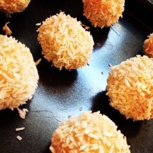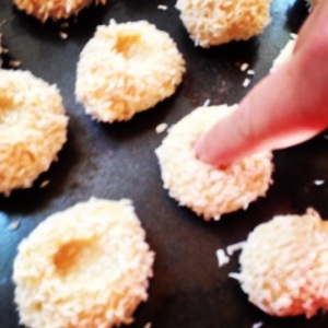 Roll the dough into 1 1/4-inch balls. (If you have a scale they should each weigh 1 ounce.) Dip each ball into the egg wash and then roll it in coconut. Place the balls on an ungreased cookie sheet and press a light indentation into the top of each with your finger. Drop 1/4 teaspoon of jam into each indentation. Bake for 20 to 25 minutes, until the coconut is a golden brown. Cool and serve.