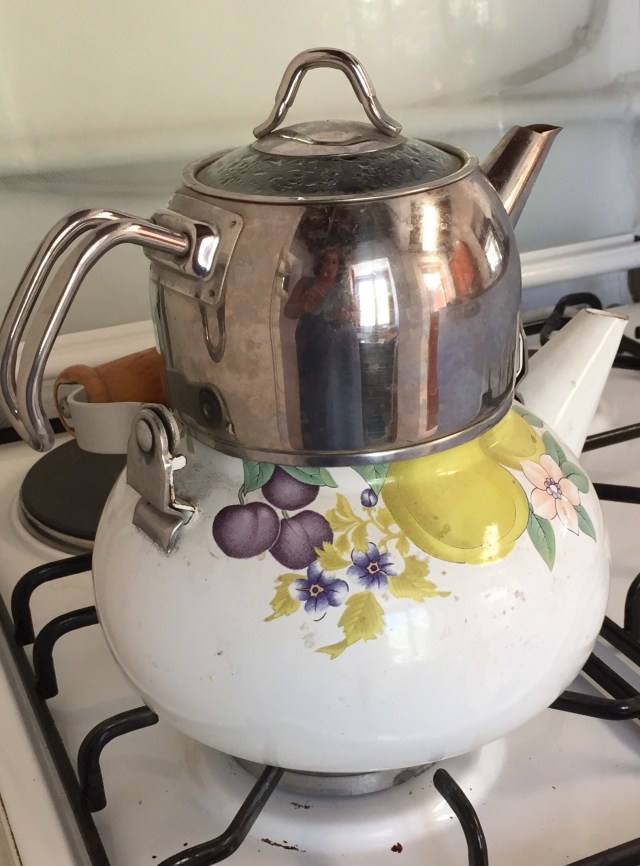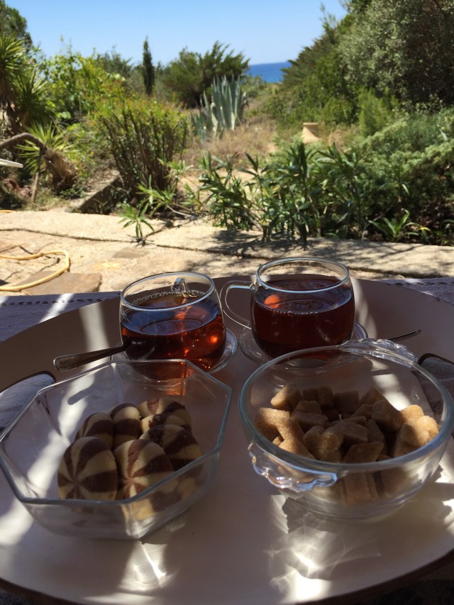 And then there are the visits from her husband’s good friend on the western Aegean island. This year, when he greeted her warmly in Turkish, he both shook her hand and patted the top of her hand with his other hand. Progress! She thought. He even looked her in the eye. But other than that moment of visibility, she became mostly invisible again. Every afternoon, he stops by for tea, which she dutifully prepares in the double-boiling process. She prepares a tray with two glasses of tea, a bowl of sugar lumps and a plate of cookies (his favorite cookie has Nutella in it). She walks it out to the breezy spot where the friend and the husband sit, talking about life.